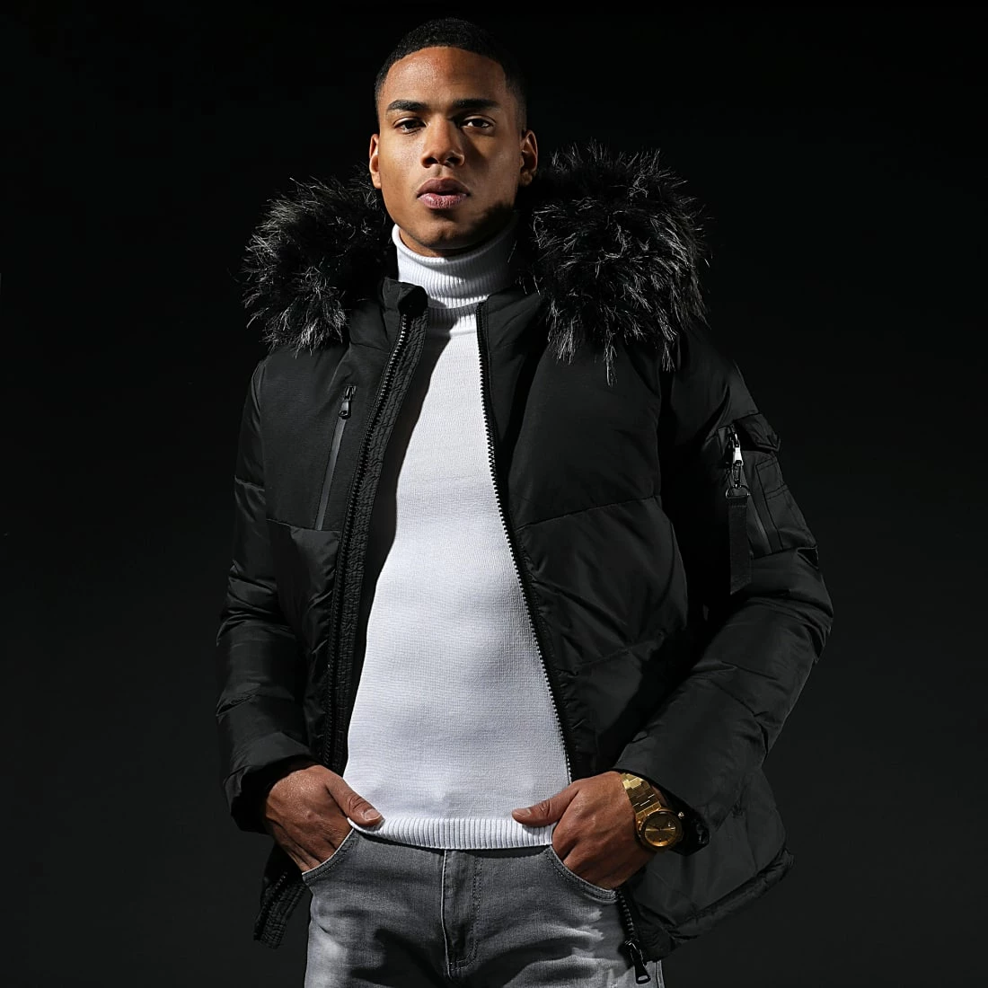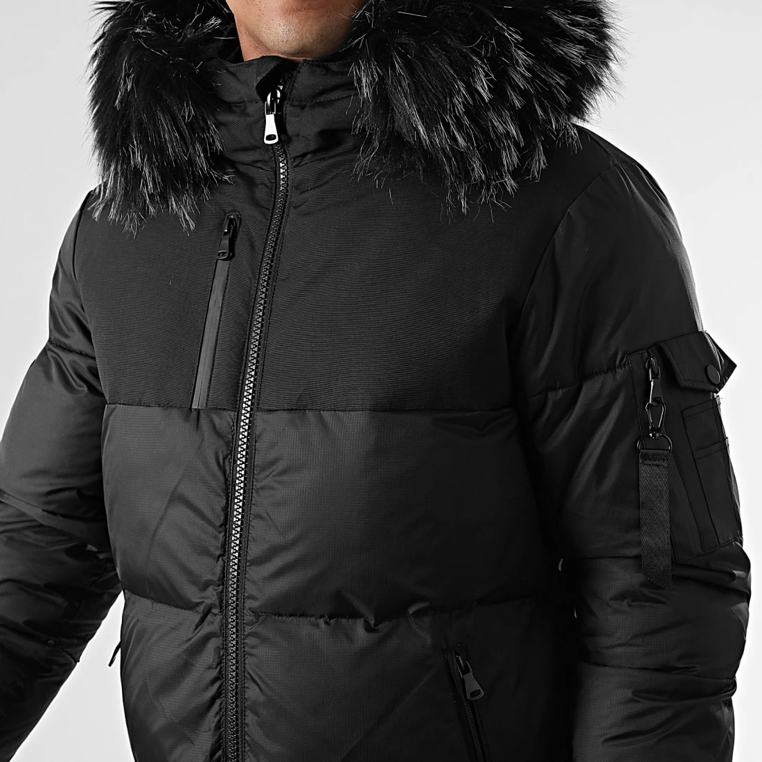 • Doudoune rembourrée à capuche avec fourrure synthétique amovible par boutons pression