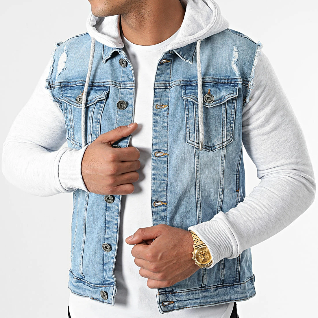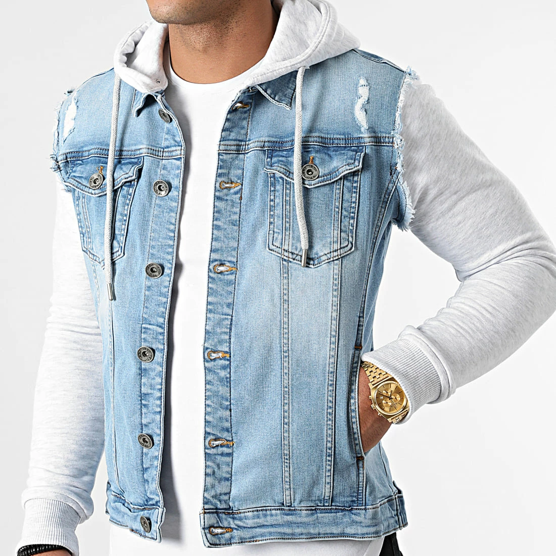 Nouveau 🥰 Veste Jean A Capuche 1519 Bleu Denim Gris Clair de LBO 🔥